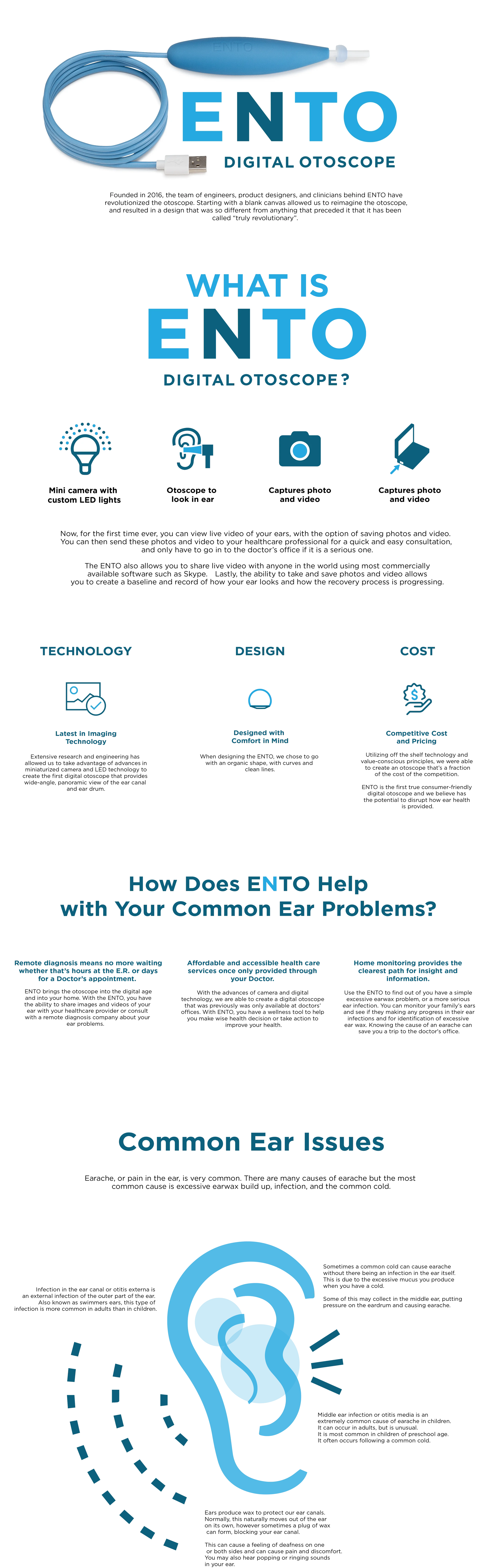 Ento is a digital at-home otoscope that allows users to safely look inside their ears and share video footage directly with their doctors — bridging the gap between home care and professional medical insight. Designed for clarity, ease, and trust,