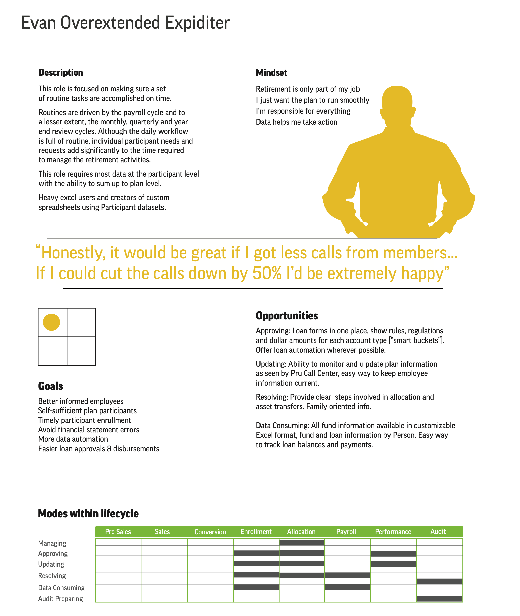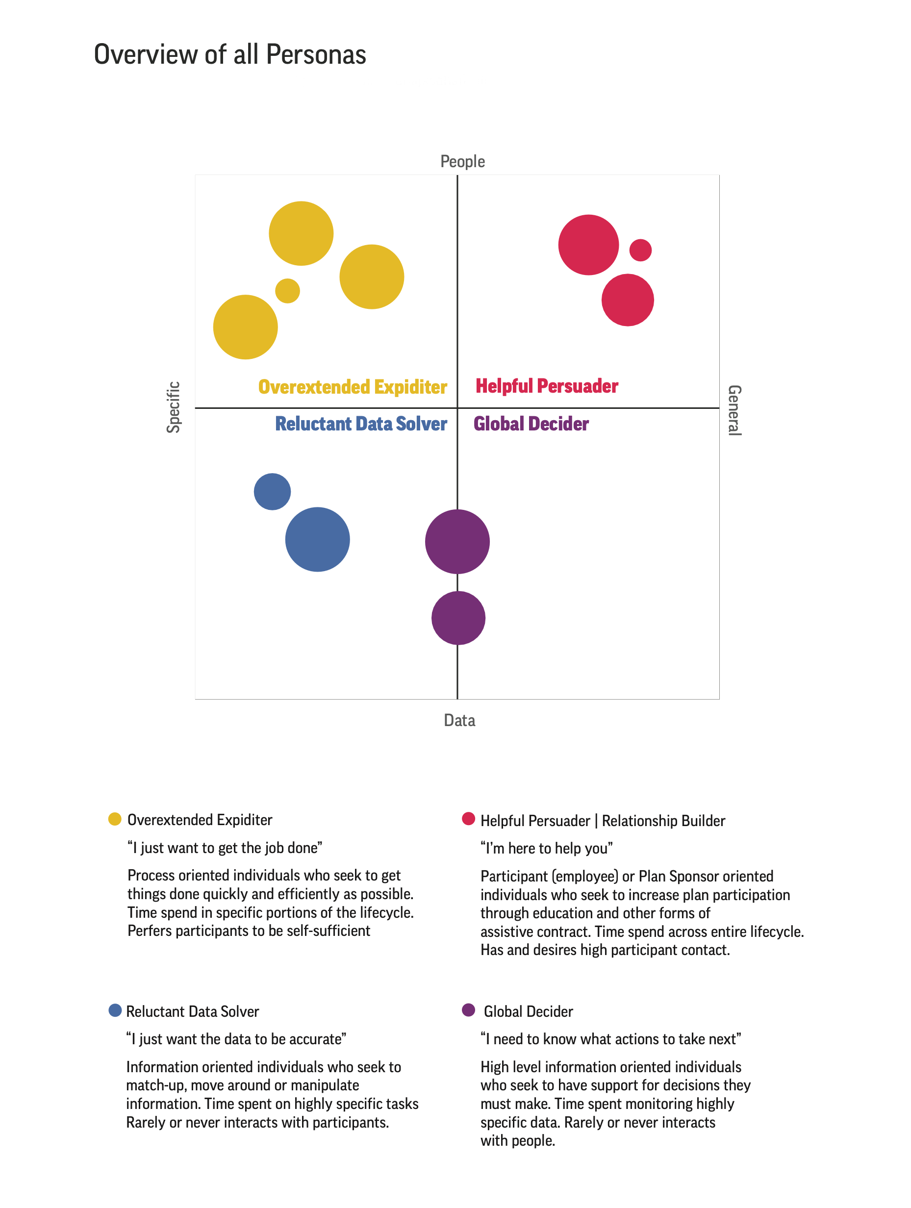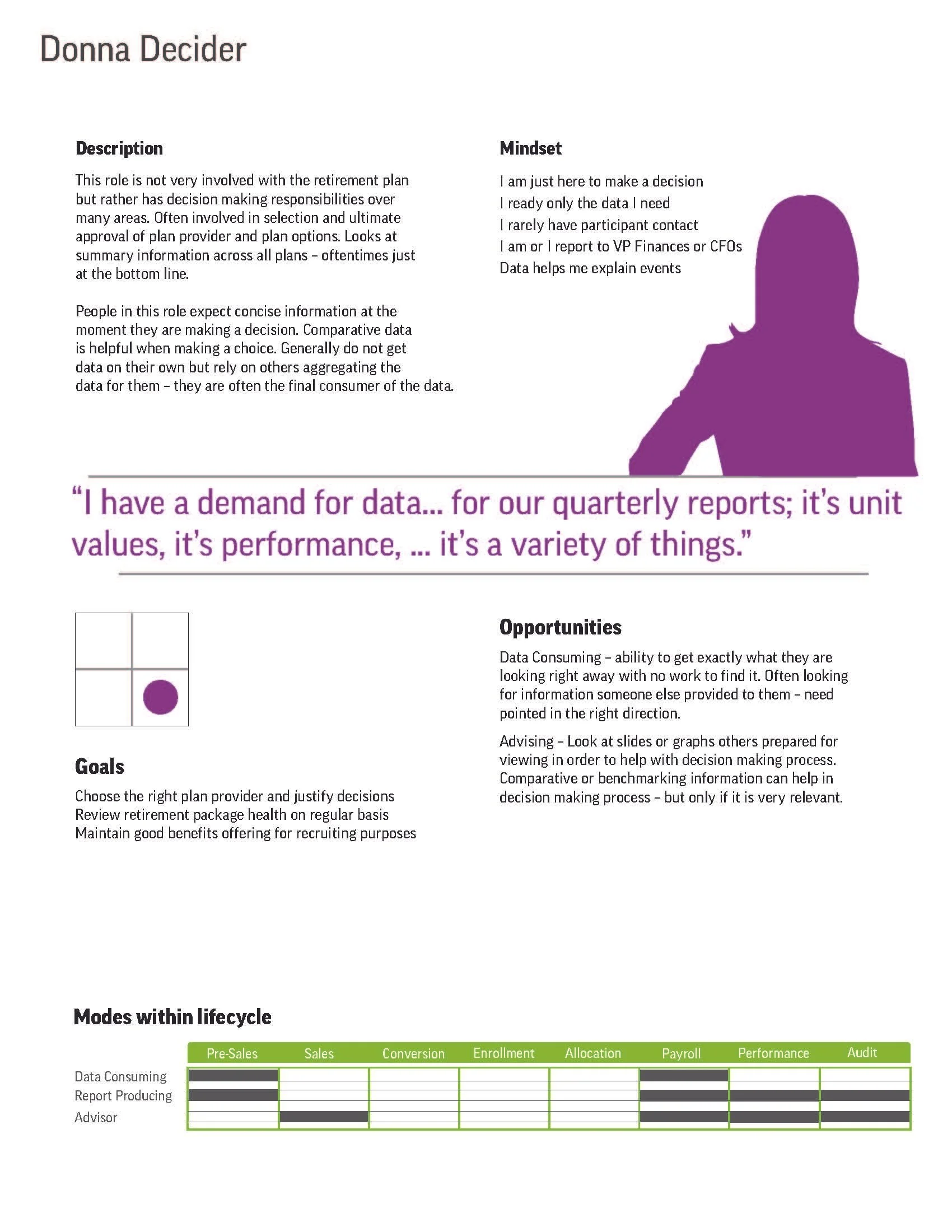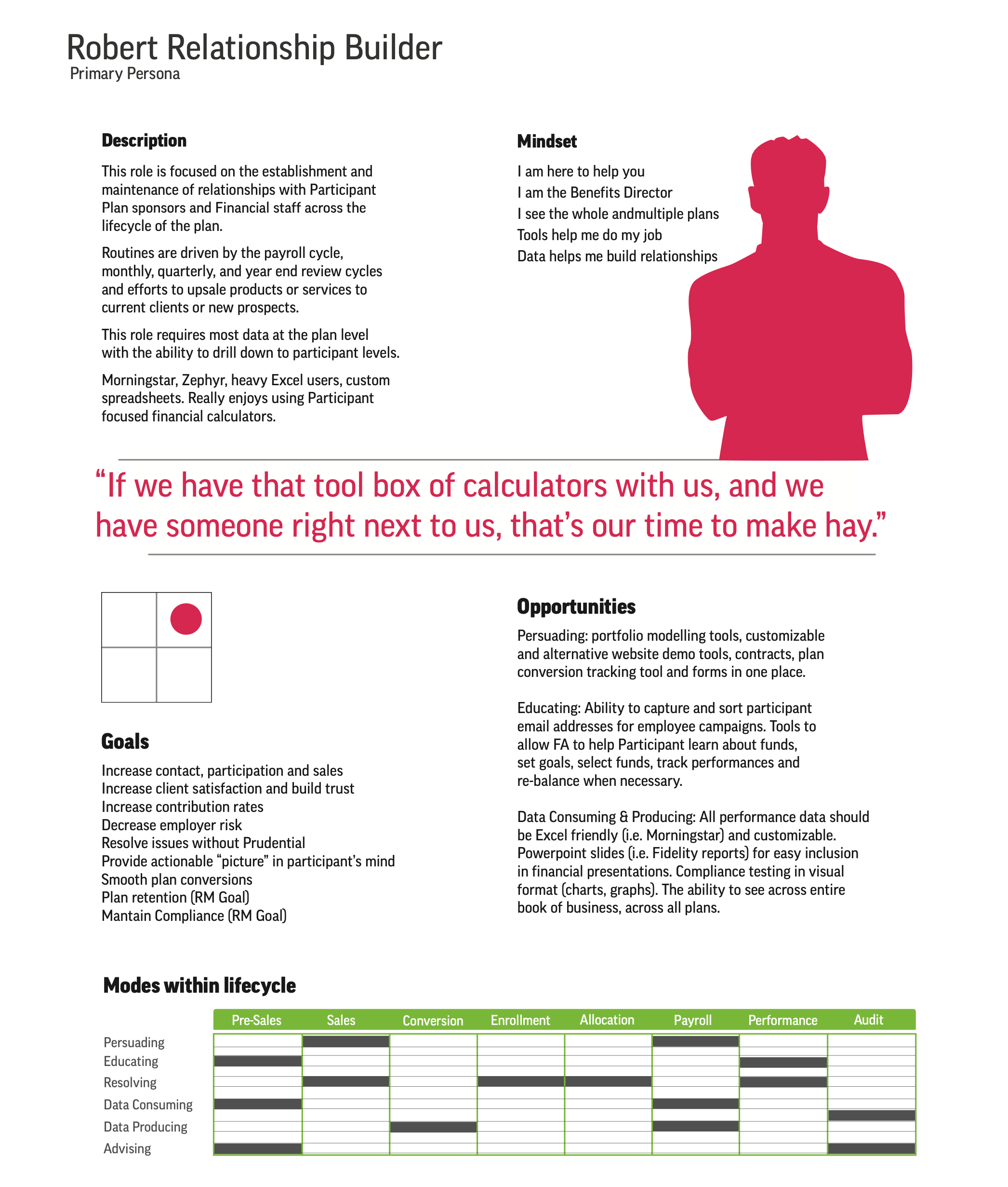 Our work extended beyond the interface to include persona development, lifecycle mapping, and behavioral modeling, helping the team understand different user mindsets — from the analytical “Global Decider” to the relationship-focused “Robert Relationship Builder.” These personas informed every design decision, from layout hierarchy to dashboard visualizations.